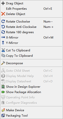 用鼠标右键单击TC7107元件,弹出如下图(图5.25)所示的快捷菜单。选择菜单中的选项可对元件进行移动(Drag Object)、旋转、编辑和删除等操作。