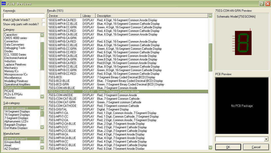 打开“Pick Devices”对话框,在“Category”列表中选择“Optoelectronics”,在“Results”中选择“7SEG-COM-AN-GRN”(共阳极七段显示数码管,绿色光),如图5.26所示。单击“OK”按钮将元件放置在原理图中。