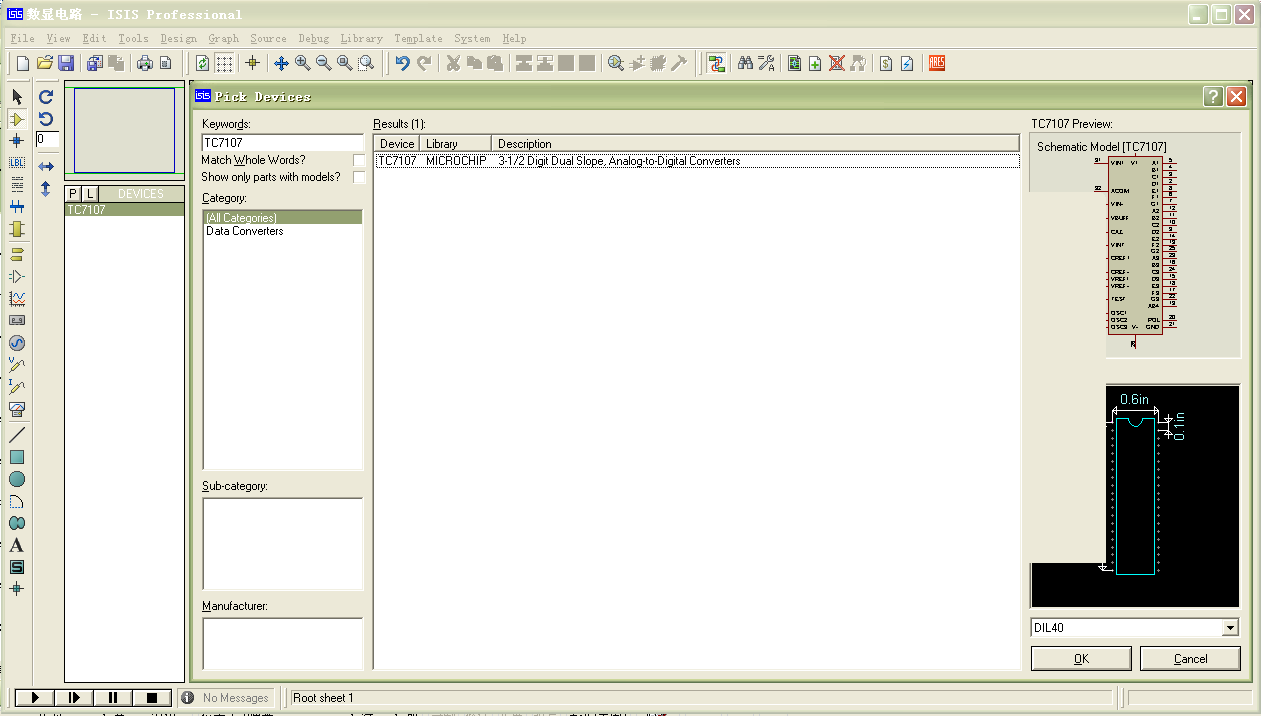 在“Keywords”(关键字)文本框中输入“TC7107”,然后从“Results”列表中选择所需要的型号,此时在元器件预览窗口中分别显示出元器件的原理图符号和封装图,如图5.21所示。