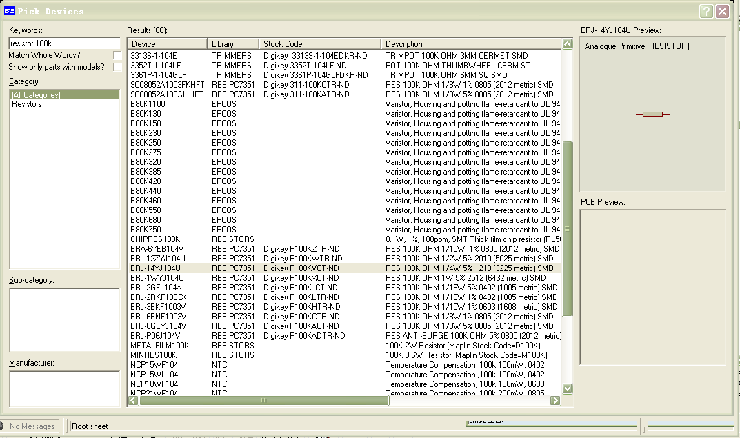 打开“Pick Devices”对话框,由于电阻元件的类型较多,可直接在“Keywords”文本框中输入“resistors 100k”, “Results”列表中则显示出各种功率的100k电阻,在列表中选择“100K 1/4W”电阻,点击“OK”放置元件。如图5.27所示。用同样的方法添加其他电阻到原理图编辑窗口。
