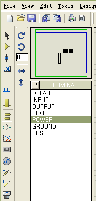 单击左侧小工具箱的终端按钮,则在对象选择器中显出各种终端,从中选择“POWER”终端,可在预览窗口看到电源的符号,如图5.31所示。用鼠标将电源符号放置到原理图中。