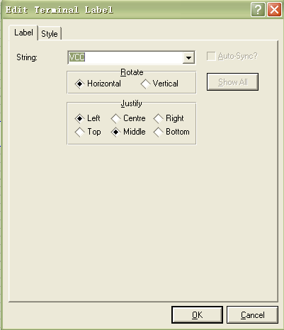 在电源终端符号上双击鼠标左键,在弹出的“Edit Terminal Label”对话框内的“String”文本框中输入“VCC”,如图5.32所示。最后单击“OK”按钮完成电源终端的放置。用同样的方法放置“地”终端。