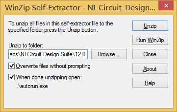 2选择“确定”后,出现图1.3所示解压对话框,默认解压和安装路径为C:\National Instruments Downloads\NI Circuit Design Suite\12.0,点击“Browse”修改路径,选择“Unzip”进行解压。