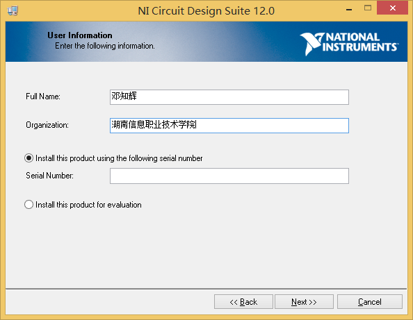 5选择“Install NI Circuit Design Suite 12.0”进行安装,接着会提示输入用户信息和序列号,如图1.6所示。序列号择选“Install this product using the following serial number”,在“Serial Number”处输入序列号。