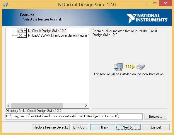 7单击“Next”,出现图1.8所示自定义功能安装对话框,默认选择“NI Circuit Design Suite12.0”,可选择安装“NI LabVIEW-Multisim”。