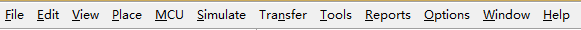 从左至右为:File(文件)、Edit(编辑)、View(视图)、Place(放置)、MCU(单片机)、Simulate(仿真)、Transfer(文件输出)、Tools(工具)、Reports(报告)、Options(选项)、Window(窗口)和Help(帮助)。
