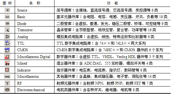 multisim提供了丰富的元器件库,元器件库图标栏如表1.1所示。