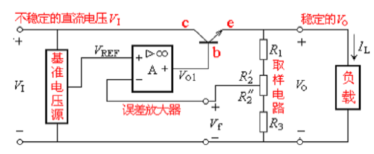 稳压原理:该电路实质上是利用了电路中的电压负反馈,将取样到的电压与基准电压进行比较后,经过放大去控制电压调整管的基极电位,从而控制发射极(即输出)电压。