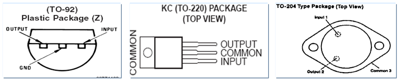 随着集成技术的不断发展,目前出现很多种类的集成稳压电路模块,它是将不稳定的直流电压转换成稳定的直流电压的集成电路,用分立元件组成的稳压电源,固有输出功率大,适应性较广的优点,但因体积大焊点多可靠性差而使其应用范围受到限制。近年来,集成稳压电源已得到广泛应用,其中小功率的稳压电源以三端串联型稳压器应用最为普遍。集成稳压模块外形封装如图3.17所示。
