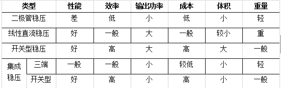通过对二极管稳压、线性直流稳压、开关型稳压和集成稳压电路等四类电路比较,如表3.4所示。