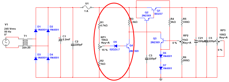 分压电阻:为减轻前级电路负担,取样电路电阻应尽量大些,且当取样电路调到最高电压时,其电流应尽量小于或等于稳压二极反向工作电流。所以有: