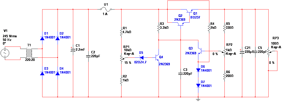 将任务一至任务五的电路进行整合,绘制在一张图上,可得到图3.21所示串联直流稳压电源电路总图。