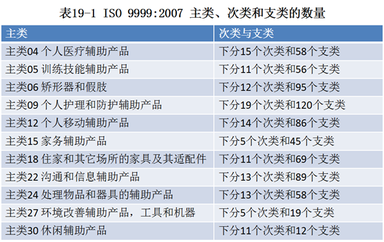 助器具和环境的关系,要追溯到史前时期的原始社会。实际上,自有人类就有残疾人,也就有辅助器具,目的是通过器具来帮助残疾人克服活动和参与的困难。如前指出,人类的活动主要是在9个人造环境里,所以创建无障碍环境的实质是用辅助器具来改造9个人造环境里的障碍,而不单纯是建筑无障碍。由于人造环境可以分为个人活动环境和公共参与环境两大类,所以针对个人活动环境的障碍,可采用个人用辅助器具来克服由于个人机能和结构损伤造成的活动困难,并创建个人用无障碍环境;而针对公共参与环境的障碍,可以采用公共用辅助器具来克服由于公共环境造成的参与困难,并创建公共用无障碍环境。目前辅助器具的分类有国际标准ISO 9999,2007年发布的第四版ISO 9999《残疾人辅助产品分类和术语》,将725种辅助产品分为11个主类、129个次类和707个支类。该国际标准中的主类名称和次类、支类的数量见表19-1。