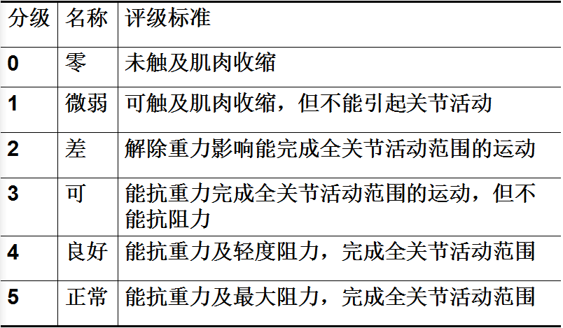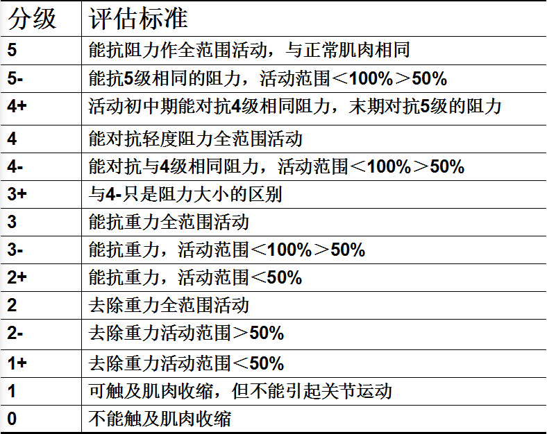 检查体位:坐位(5-0级)仰卧位(1-0级)