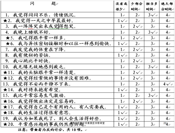 由Zung编制于1965年。能相当直观地反映病人抑郁的主观感受,多用于门诊病人的粗筛、情绪状况评定及调查等。