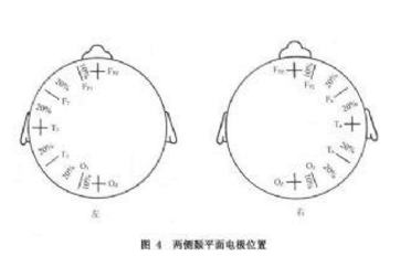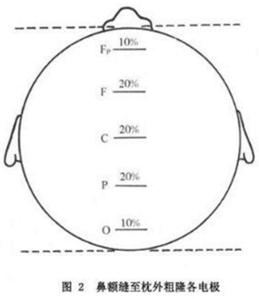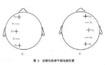 从Fp1至O1及Fp2至O2各做一连线,为矢状旁平面,从Fp1向后各20%分别放置电极1个,左侧为F3(左额),C3(左中央)及P3(左顶),P3应距O1 20%。右侧与此相同,电极为F4(右额)C4(右中央)及P4(右顶)(图5)。