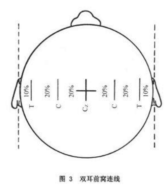另一基线为双耳前窝连线(图3)从左向右距左耳前窝10%为T3(左中颞)电极,以后向右每20%放置一个电极,依次为C3(左中央),Cz应与鼻额缝枕外粗隆连线Cz相重合,Cz向右20%为C4(右中央),T4(右中颞),T4应距右耳前窝10%。