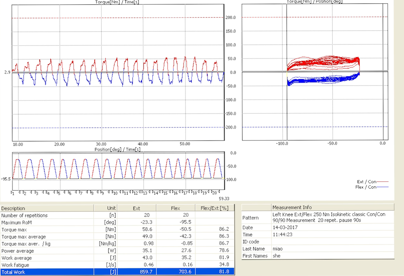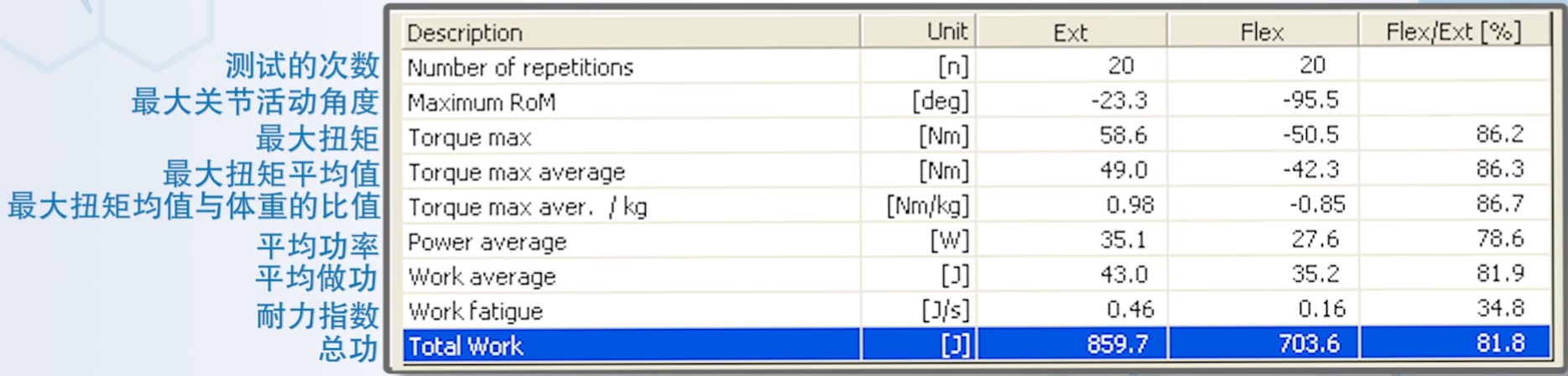 描述性结果:测试的次数,最大关节活动角度,最大扭矩,最大扭矩平均值,最大扭矩均值与体重的比值,平均功率,平均做功,耐力指数,总功,以及屈伸肌群各指标的比值等。