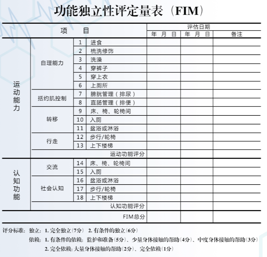 IADL量表:功能活动问卷(FAQ)、功能综合评定量表(FCA)、Frenchay活动指数、快速残疾评定量表(RDRS)、功能独立性评定(FIM)