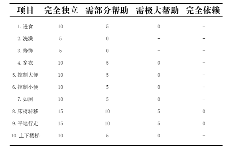 包括进食、穿衣、转移、步行、大便控制、小便控制、用厕、上楼梯、修饰、洗澡等10项内容。