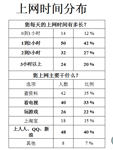 同学上网的主要活动,上网更多的被用来听歌,看电影,玩游戏(55%),聊天等(40%),被用于学习的比例较低,网络并没有被很好地利用,从调查过程中走访各学校的寝室来看,大多数同学将电脑用来打游戏,看电影,用来学习的同学较少。在双休日,大量的时间也被用于了上网,看电影。