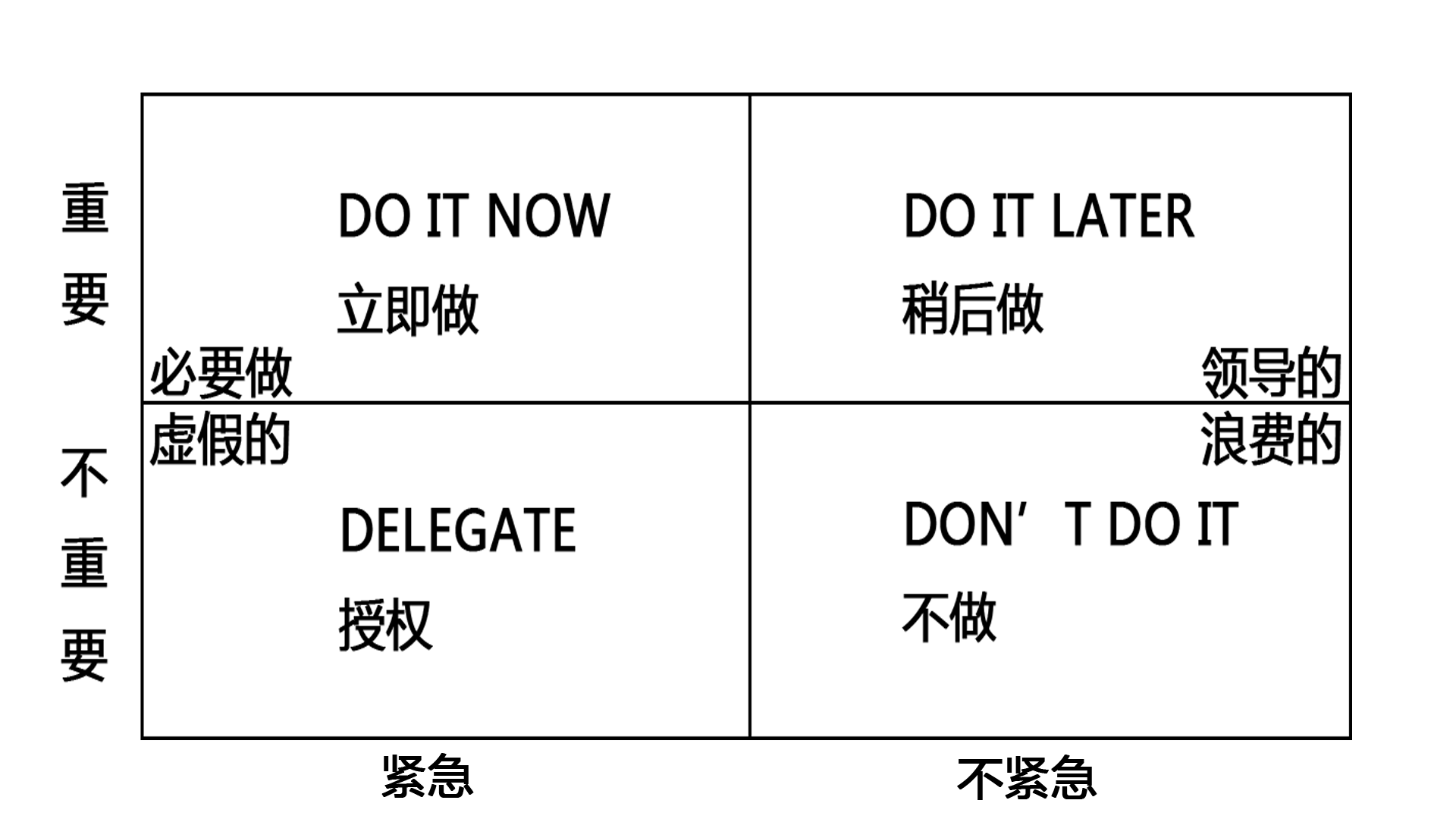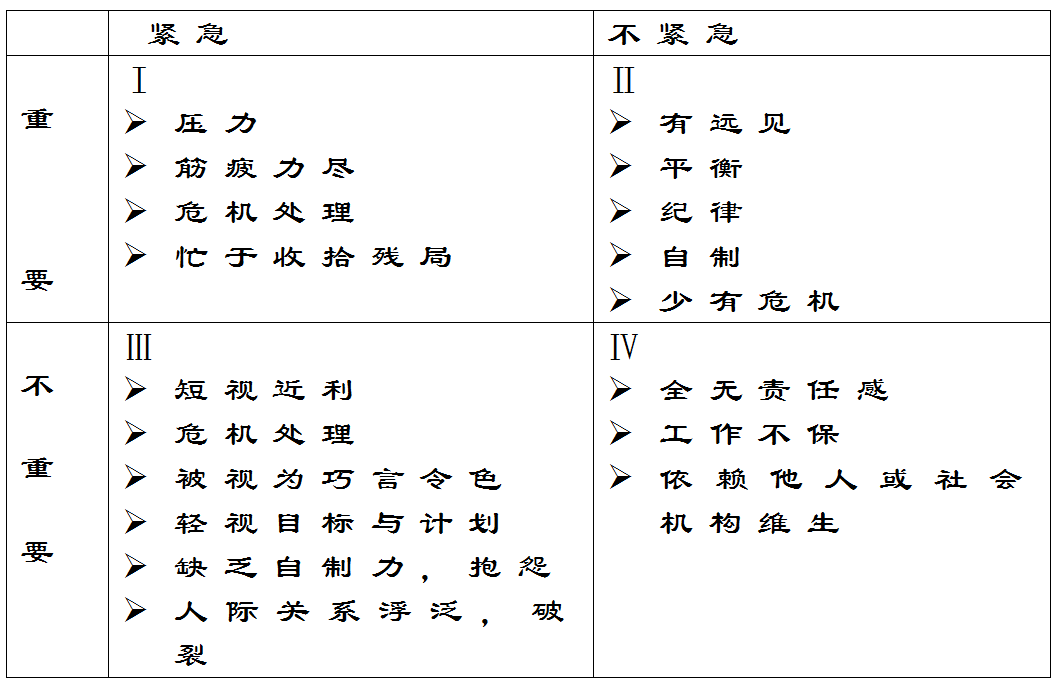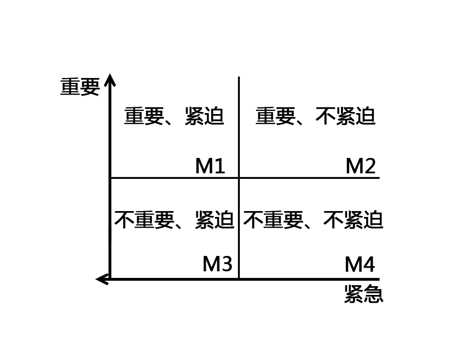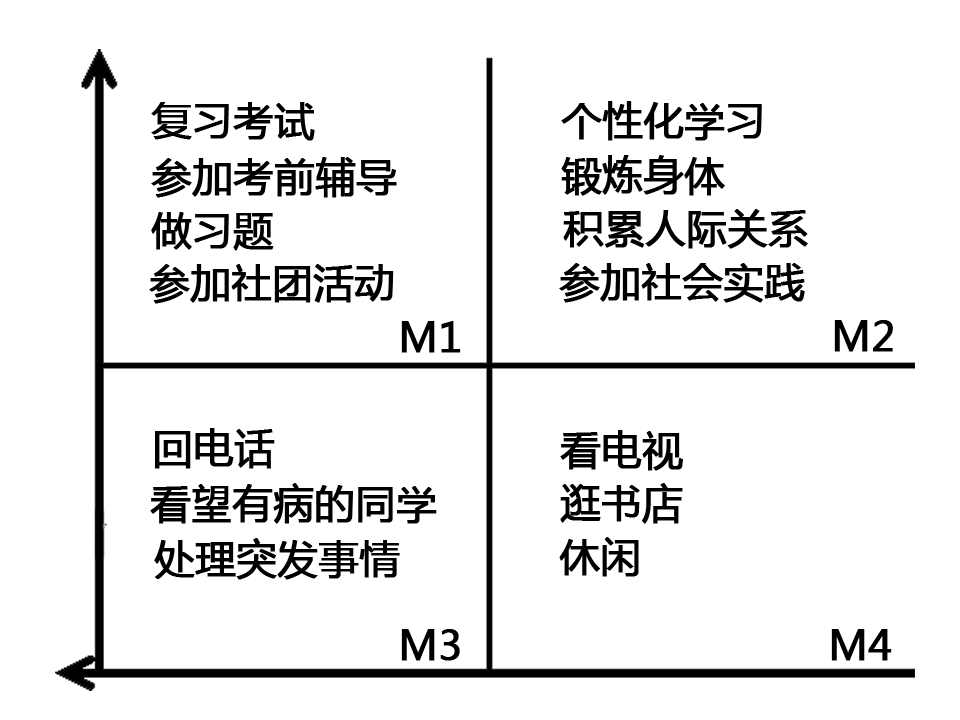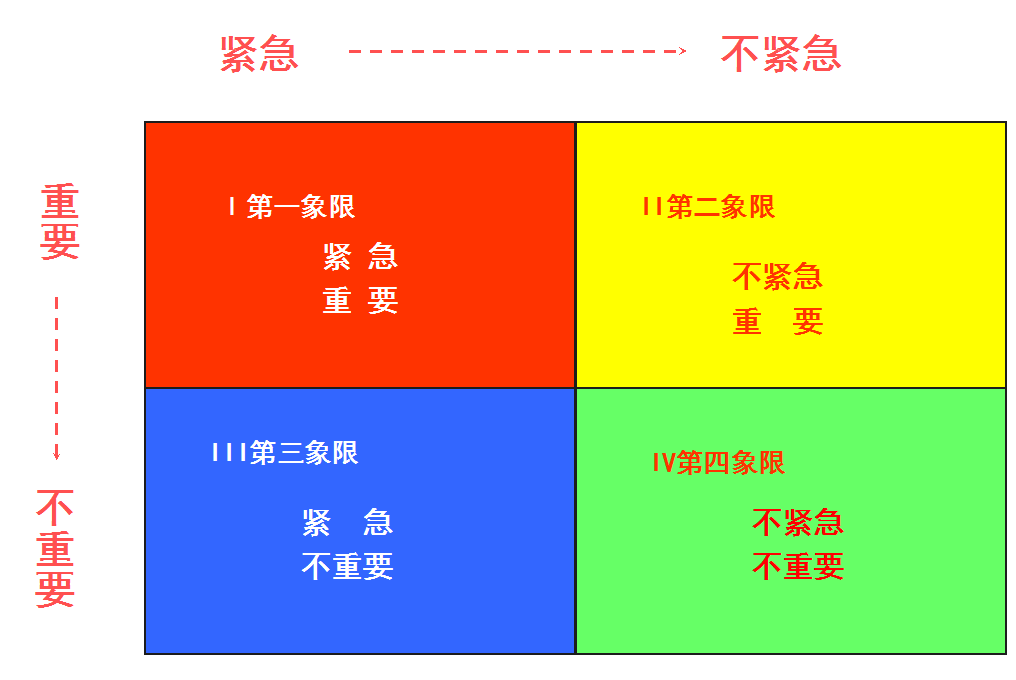 著名管理学家科维提出了时间管理的理论,把工作按照重要和紧急两个不同的程度进行了划分,分为四个“象限”:既紧急又重要、重要但不紧急、紧急但不重要、既不紧急也不重要。这就是关于时间管理的“四象限法则”。
