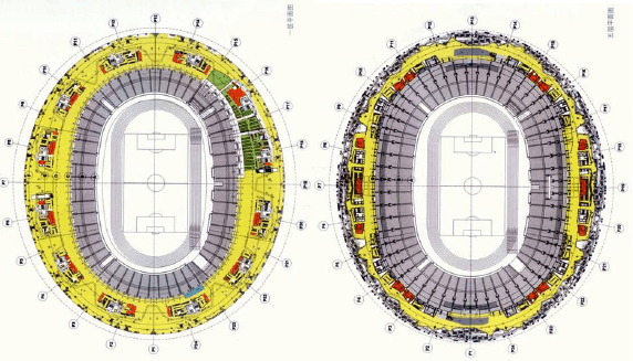 此外,在建筑的过程中,经过对安全问题的慎重考虑,设计师们取消了原来设计方案中的可伸缩顶棚,使得体育馆的抗震能力进一步得到了加强。由于观众席每一层疏散通道都是独立的,没有交叉,人员疏散可以在8分钟内完成。