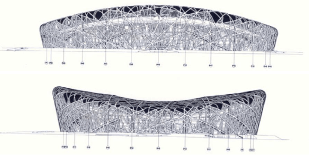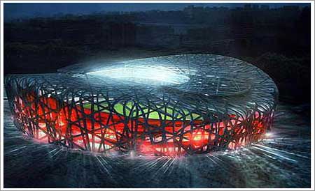 2008年北京奥运会主体育场——“鸟巢”的设计方案是经全球设计招标产生的。最后由2001年普利茨克奖获得者赫尔佐格、德梅隆与中国建筑师李兴刚等合作完成的巨型体育场设计,形态如同孕育生命的“巢”,它更像一个摇篮,寄托着人类对未来的希望。设计者们对这个国家体育场没有做任何多余的处理,只是坦率地把结构暴露在外,因而自然形成了建筑的外观。该设计方案主体由一系列辐射式门式钢桁架围绕碗状坐席区旋转而成,空间结构科学简洁,建筑和结构完整统一,设计新颖,结构独特,为国内外特有建筑。