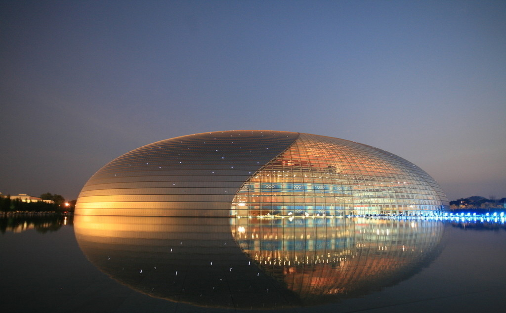 国家大剧院中心建筑为独特的壳体造型,高46.68米,地下最深32.50米,周长达600余米。壳体表面由18398块钛金属板和1226多块超白透明玻璃共同组成,两种材质巧妙的拼接曲线,营造出舞台帷幕徐徐拉开的视觉效果。每当夜幕降临,透过渐开的“帷幕”,金碧辉煌的歌剧院尽收眼底,而壳体表面上星星点点、错落有致的“蘑菇灯”,如同扑朔迷离的点点繁星,与远处的夜空遥相呼应,使大剧院充满了一种含蓄而别致的韵味与美感。整个壳体风格简约大气,宛若一颗晶莹剔透的水上明珠。