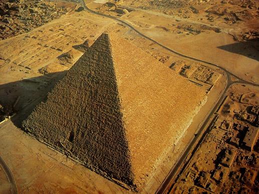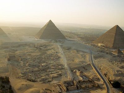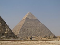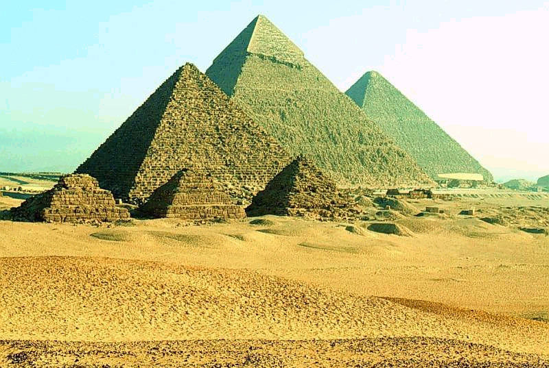 三座最大、保存最完好的金字塔是由埃及第四王朝的三位皇帝胡夫(Khufu)、海夫拉(Khafra)和门卡乌拉(Menkaura)在公元前2600年—公元前2500年建造的。胡夫金字塔高146.6m,底边长230.35m;海夫拉金字塔高143.5m,底边长215.25m;门卡乌拉金字塔高66.4m,底边长108.04m。在这3座大金字塔中最大的是胡夫金字塔,它是一座几乎实心的巨石体,用200多万块巨石砌成。成群结队的人将这些大石块沿着地面斜坡往上拖运,然后在金字塔周围以一种脚手架的方式层层堆砌。金字塔的旁边还有一些皇族和贵族的小小的金字塔和长方形台式陵墓。