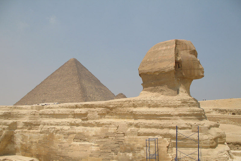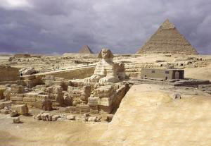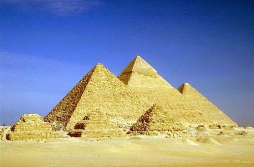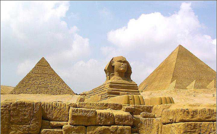 建成的金字塔被用陵墓。古埃及人相信死后永生,金字塔内的墓穴的起初堆满了黄金和各种贵重物品。胡夫金字塔是十座金字塔是最大的一座,在海夫拉金字塔祭祀厅堂的门厅旁边,有一座高约20m、长约46m的狮身人首像,大部分就原地的岩石凿出。