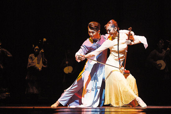 2.双人舞:由两个人表演共同完成一个主题的舞蹈。多用来直接抒发人物的思想感情的交流和展现人物的关系。