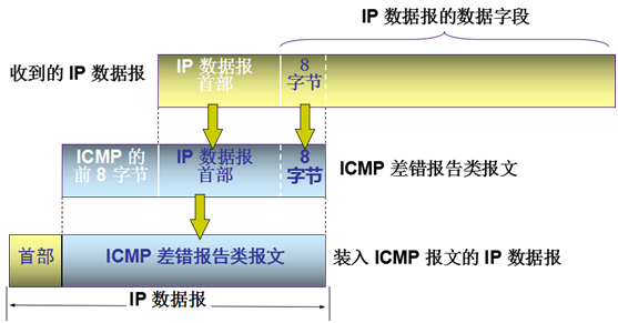 所有ICMP差错报文中的数据字段都具有同样的格式。将收到的需要进行差错报告的IP数据报的首部和数据字段的前8个字节提取出来,作为ICMP报告的数据字段。再加上相应的ICMP差错报告报文的前8个字节,就构成了ICMP差错报文。提取到的数据报的数据字段的前8个字节就是为了得到运输层的端口号(对于TCP和UDP)以及运输层报文的发送序号(对于TCP)。