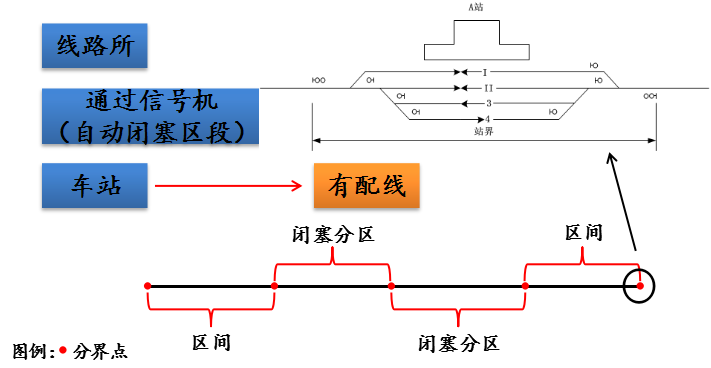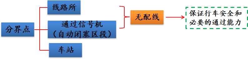分界点通常有三种形式,线路所、自动闭塞区段的通过信号机和车站。在这三类分界点中,线路所和自动闭塞区段的通过信号机是属于没有配线的分界点;其主要作用在于保证行车安全和必要的通过能力。