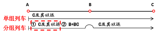 单组列车是指 全部由到达列车终到站及其以远的车辆编组而成;车辆可能混编,也可能按某些特定要求分组;编组内容在列车到达终到站以前不变。 如下图所示的线路,单组列车,就是列车终到站是C站,列车中的车辆全部是由终到站C站及其以远组成,这个列车在到达C站前编组内容是不会发生变化的。