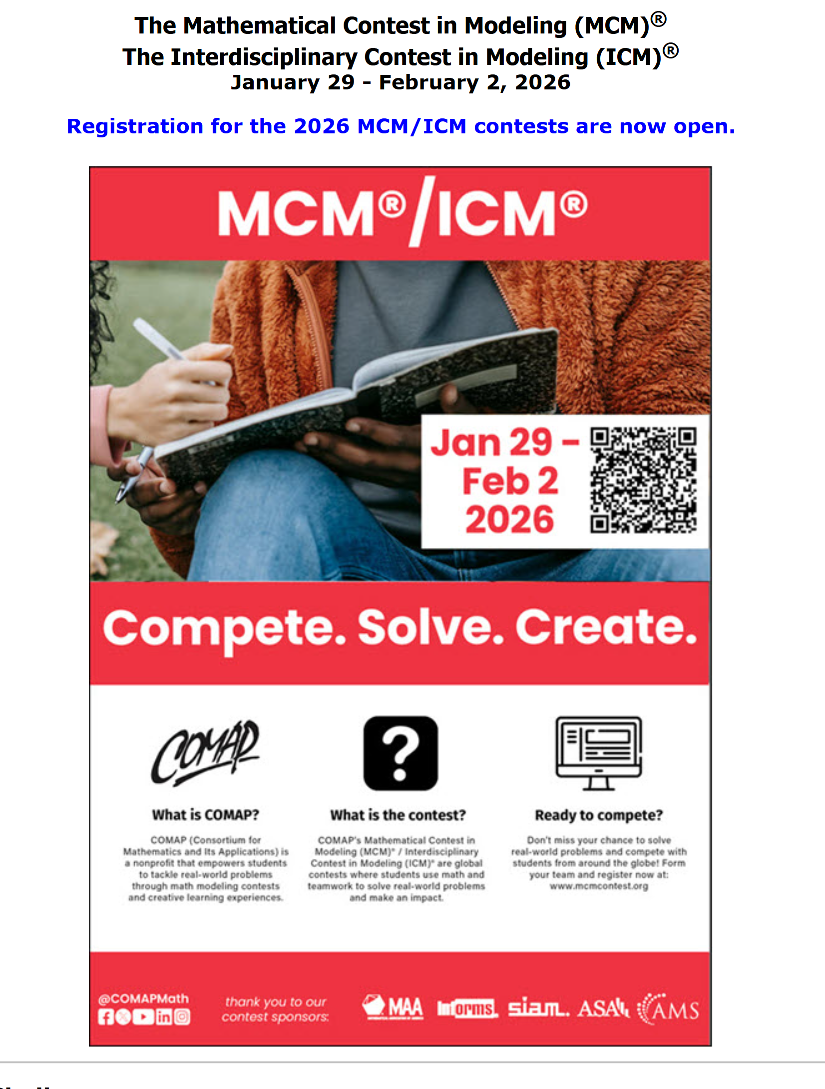 2、比赛问题也将在北京时间2026年1月29日凌晨5:50在以下镜像网站上精确查看:https://www.comapmath.com/MCMICM/index.html