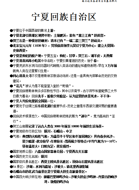 (二)认读宁夏回族自治区旅游资源分布图,熟知该地区的主要旅游景点