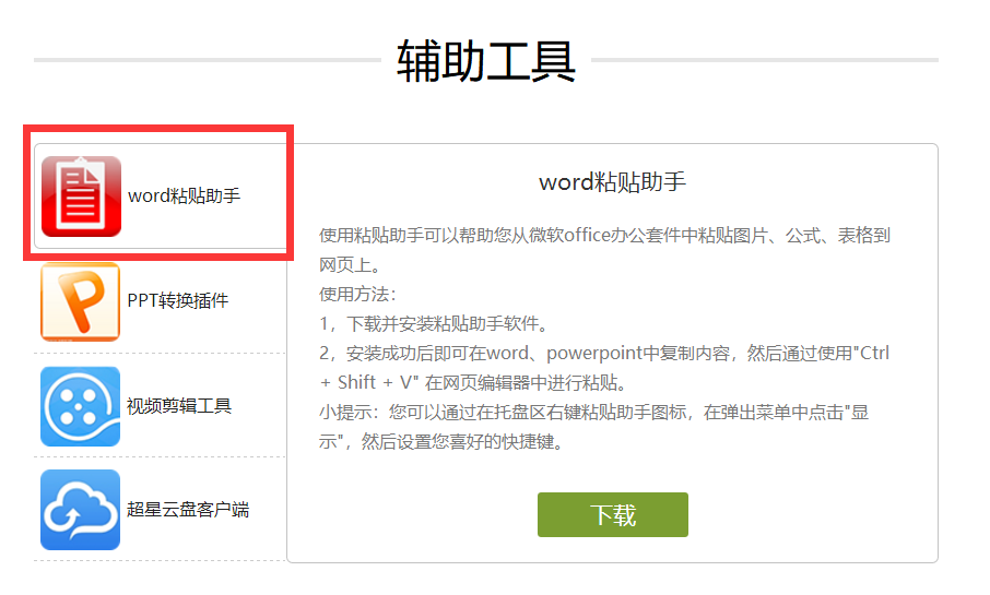 Word文件内容粘贴提示:课程章节内容编辑过程中,如果需要将其他Word文件中的内容,包括公式、图片等一并复制粘贴进来,可点击保存按钮左侧的“下载小工具”,下载“Word粘贴助手”,利用“Ctrl+Shift+V”即可原格式粘贴。
