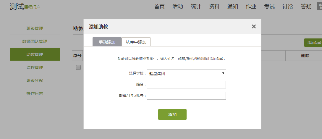 泛雅平台建立课程允许教师在课程中加入助教。点击左侧标题栏“助教管理”选项,则可手动输入姓名账号,或直接从库中筛选信息加入课程的助教。