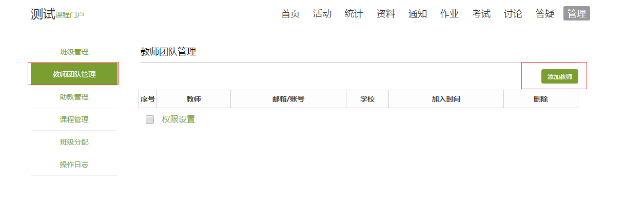 教师可对教师团队和助教进行查看和移除的操作。还可设置教师和助教的权限。