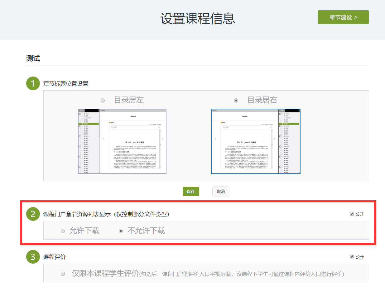 课程门户章节资源列表资源,是否允许下载,在本页设置,如下图: